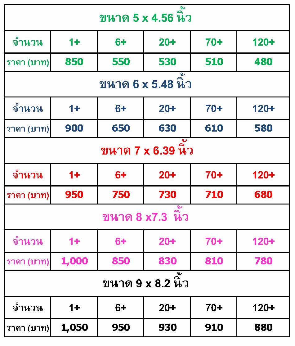 | เพิ่มเติม | 1.ราคาขายที่แสดงนี้ เริ่มต้นความสูงของตัวโล่ 5 นิ้ว 2.ราคารวมการสลักเลเซอร์ข้อความและโลโก้แล้ว ลงสีไม่เกิน 2 สี |